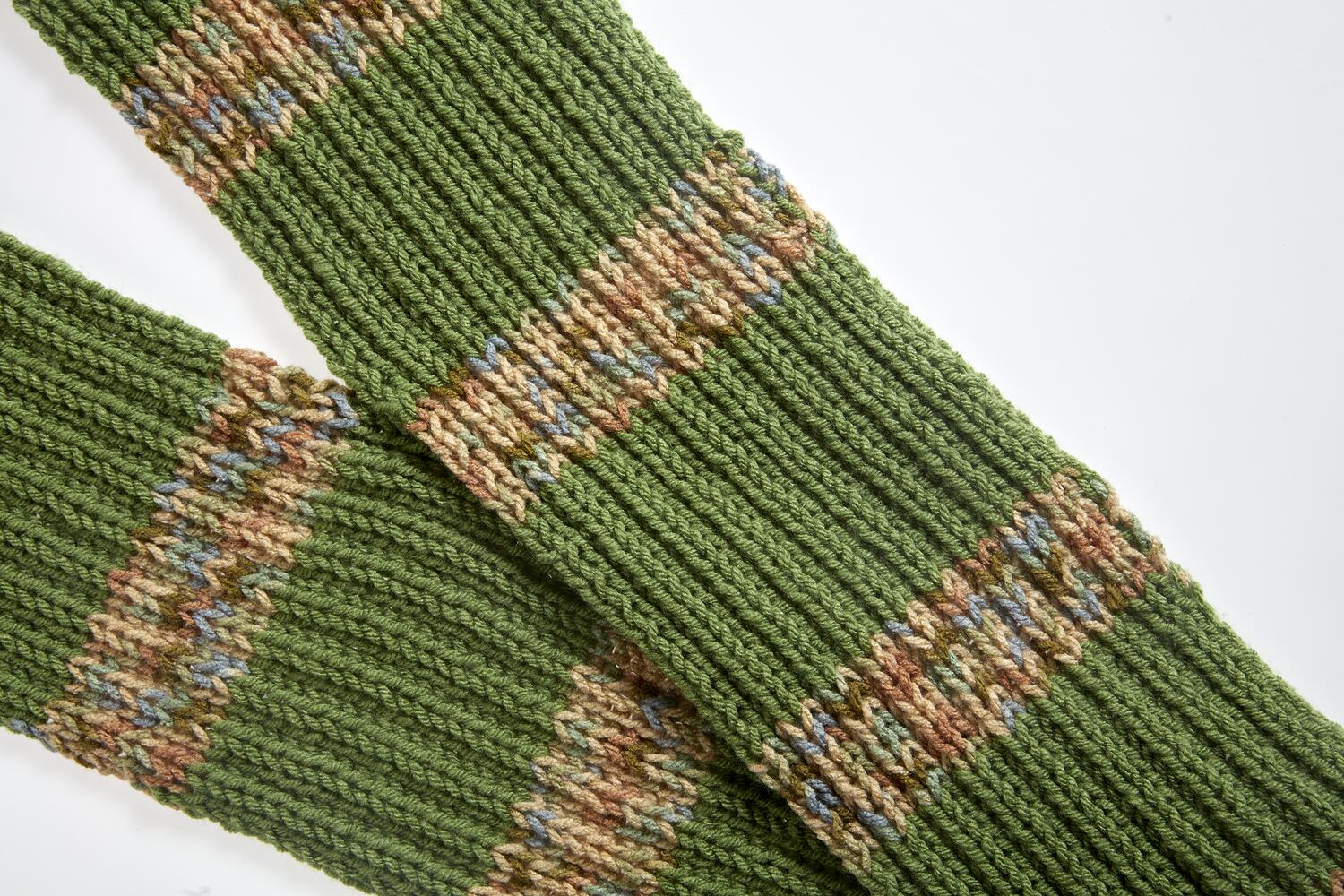 Hand-knitted scarf in light green yarn (50% acrylic 50% wool) with light coloured stripes. This scarf was knitted by resident of Cherry Tree Grove Retirement Village, Diana Pullin, as part of Maroondah City Council's Knit One Warm One Project that was initiated in response to the COVID-19 pandemic. This scarf was one of two scarves donated by Diana Pullin to Museums Victoria following an oral history interview and photoshoot with Diana that was conducted by Museums Victoria curator Catherine Forge at Diana's home in Croydon, Victoria, on 22 March 2021.