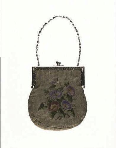 Tapestry bag. Convolvulus flowers and leaves design on fawn background. Held on silver frame, one side of which is decorated with dimontes, the other embossed with a leaf design. A silver chain is attatched to the frame. Inside is a lining of fawn silky material with muffle around the top, and two tiny pockets with elasitcized ruffle frills.