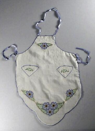 Hostess apron. White organdie, blue tatted edging, applique inserts at top and bottom of embroidered blue flower and green leaf design. Left and right breast pockets of triangular design, with same green applique leaf design and blue tatting edging. Blue ribbon loop for around neck and ties for across back.