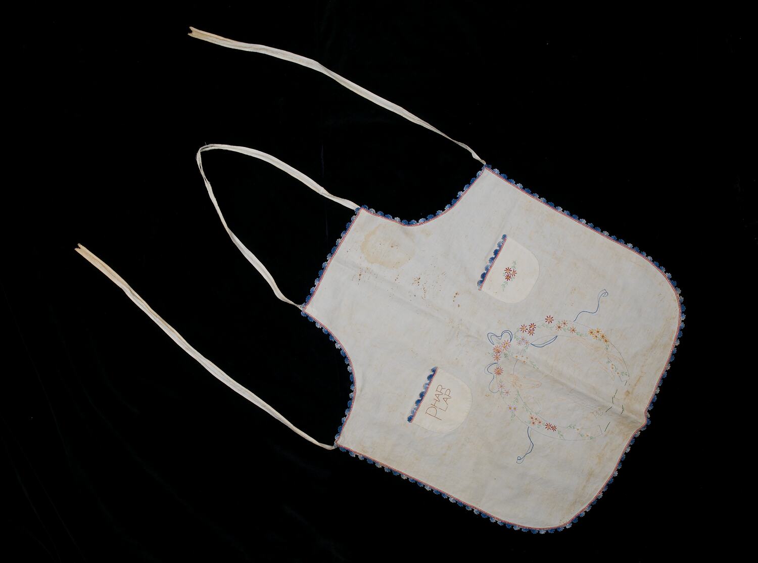 White cotton apron, full length, with tape fastening around neck and at waist. Apron has two small pockets, right one embroidered in stem stitch in brown cotton, left one embroidered with pink flowers and green leaves. Main motif on body of apron is of a horse, placed within a horseshoe shape which is covered with flowers and linked together with blue ribbon shapes. The embroidery is stem and satin stitch with French knots; apron is bordered with a polished cotton crocheted border on a pink blanket stitch base.