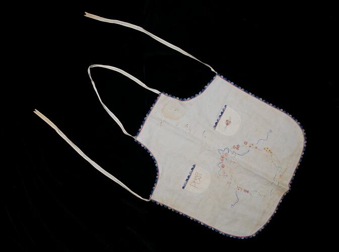 This calico apron was embroidered by an unknown person using a commercial pattern during the 1930s. It was donated to the Museum in 1985 to display as part of the SIO `Great Exhibition of Victoria'.