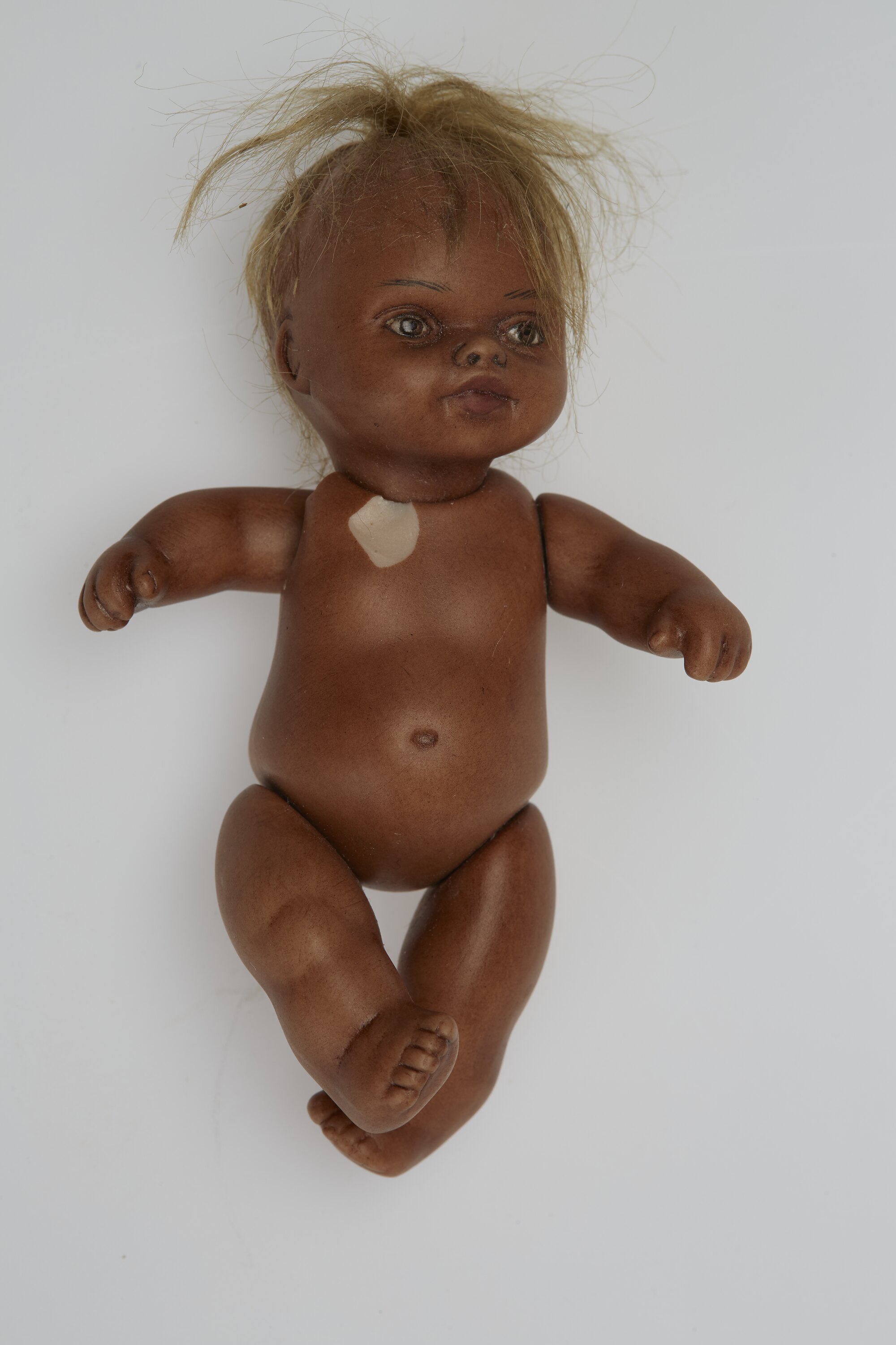 Doll with movable limbs, brown skin, brown eyes and blond fibrous hair. Some chips have come off the body.