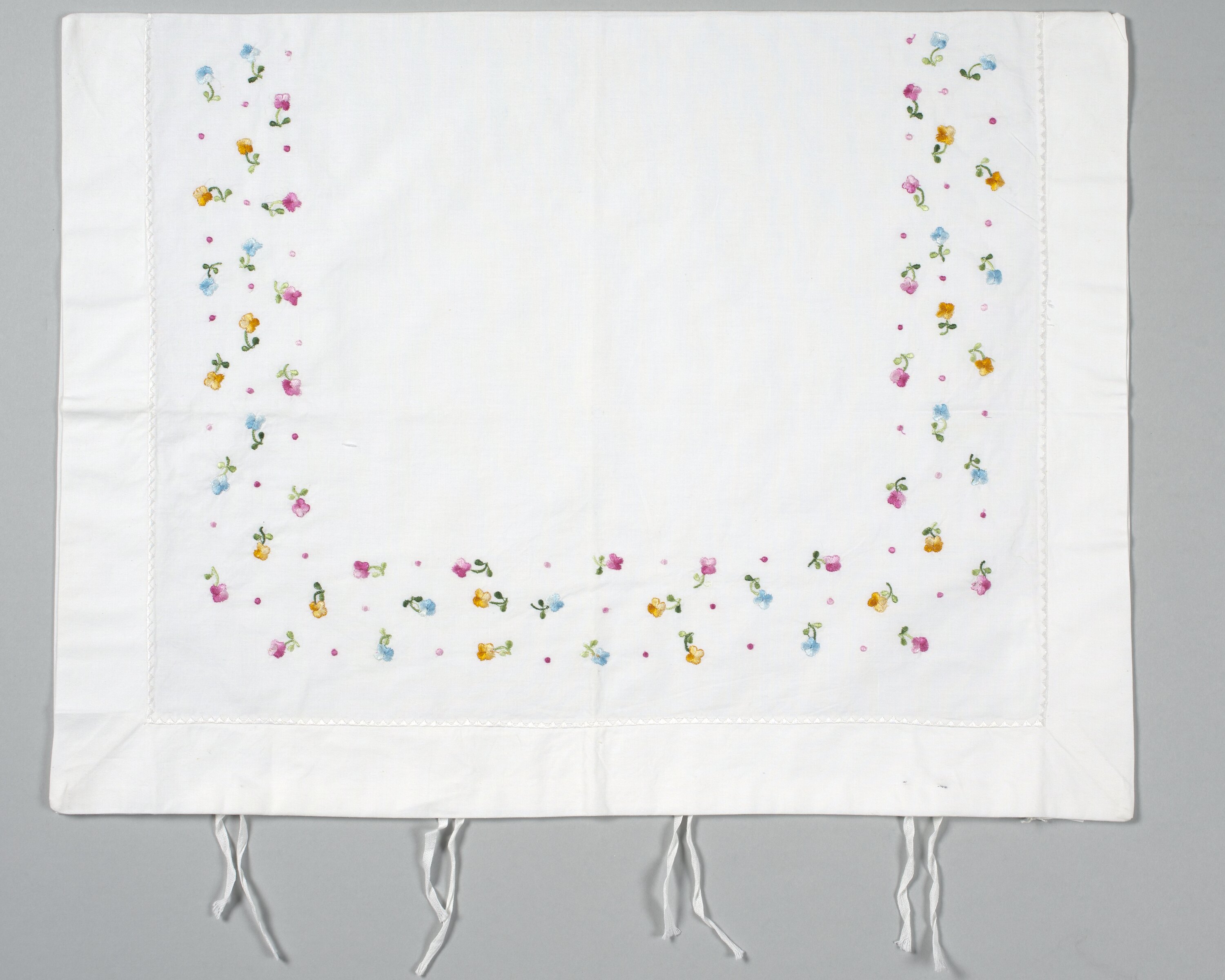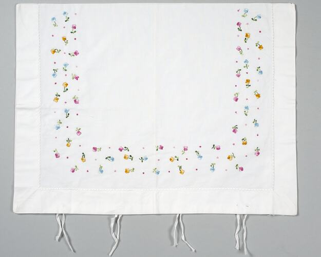 Two white pillow cases each with double band of embroidered pink, blue and orange flowers and a single band of embroidered pink flowers on three sides of the case. There are four sets of white cotton ties at one end of the case.
