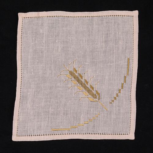 Two small square table mats,each with an embroidered wheatsheaf design in gold thread on a pale pink linen ground. The wheatsheaf motif has a central drawn threadwork lace panel and pulled threadwork is utilised in the florets and table mat border.