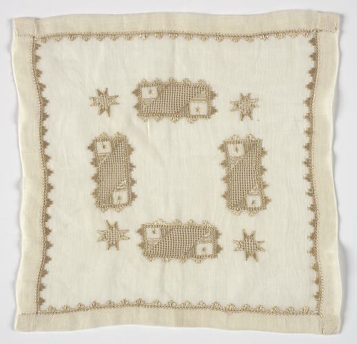 Pair of embroidered square side mats with design in gold thread on ground of cream-coloured, sheer, fine cotton/muslin. Design features 4 x star motifs and 4 x decorative rectangular lacework shapes in the centre, with a geometric border - all in embroidery, and pulled and drawn thread work.