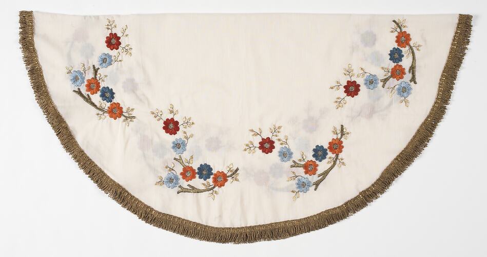 Circular white table cloth with gold fringing. There is a repeated embroidered floral pattern in dark gold coloured thread and orange, red, dark and light blue around the edge of the cloth.