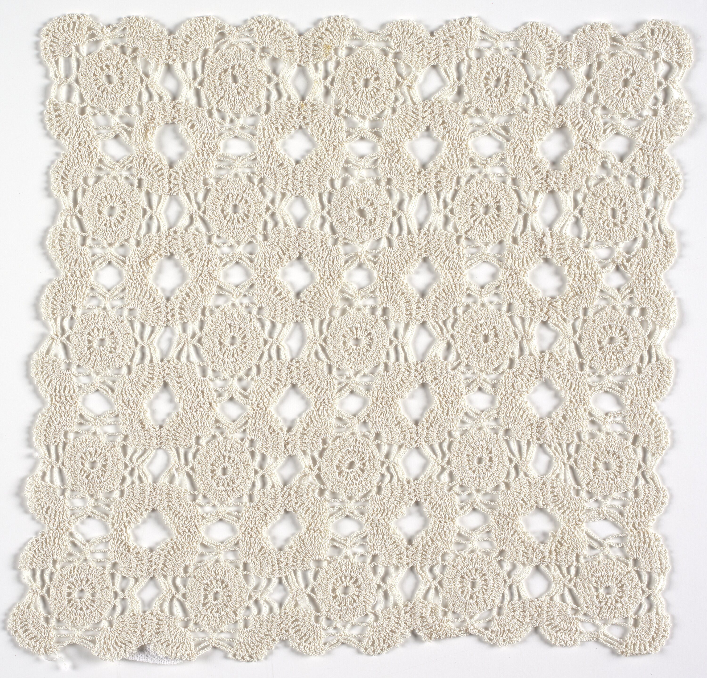 Pair of crocheted table mats, part of the dowry of Irene Soumilas. Irene migrated to Australia from the Greek Island of Lefkas in 1958 to be married in 1959. Her dowry travelled in two trunks by ship, although she travelled by air. Many of her dowry items were made by local craftswomen, although other items were given to her by family and friends still living in Greece.