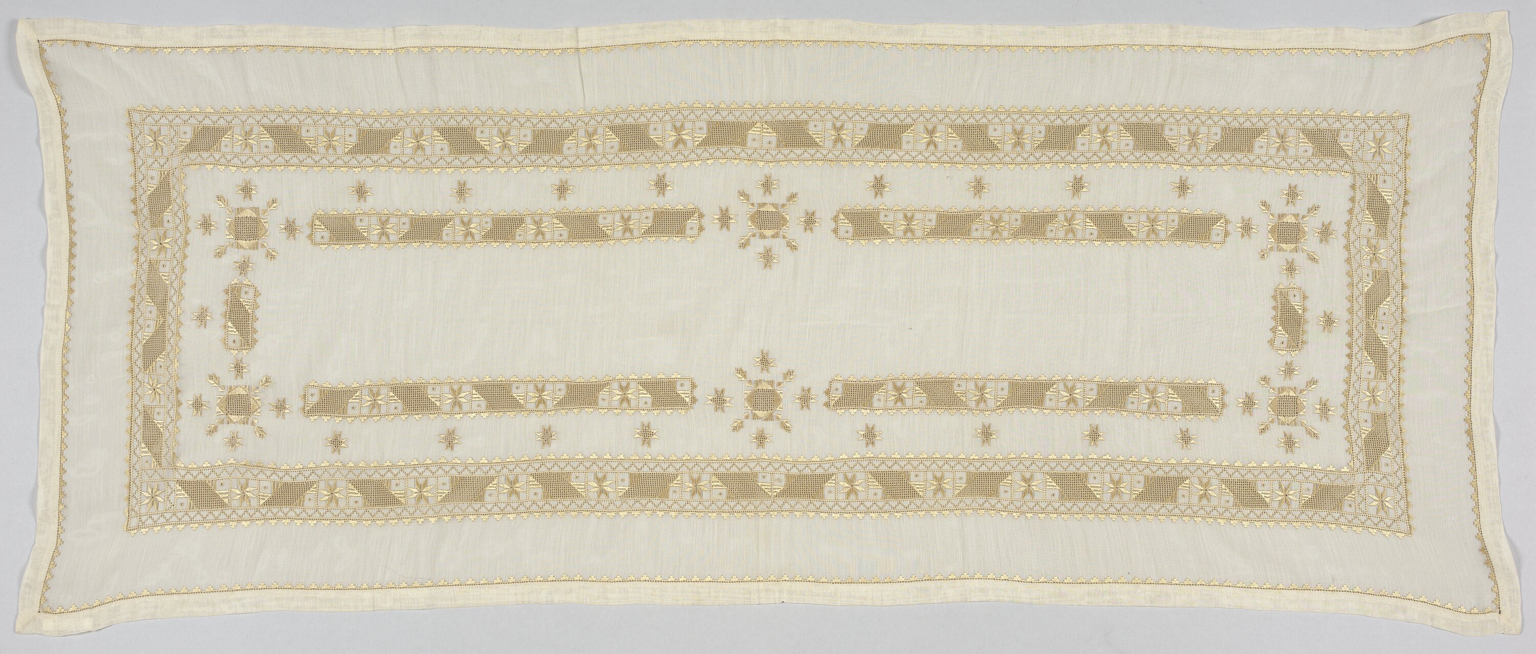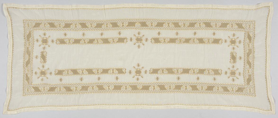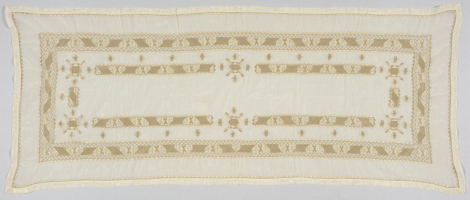 Rectangular table runner with geometric pattern in gold thread.
