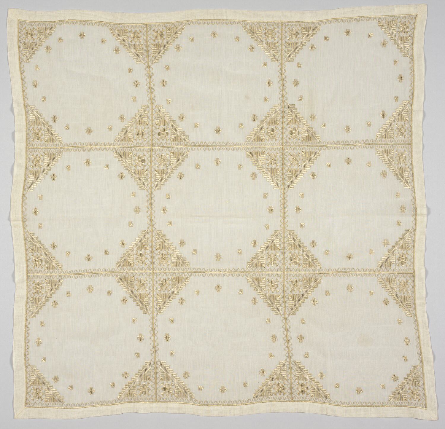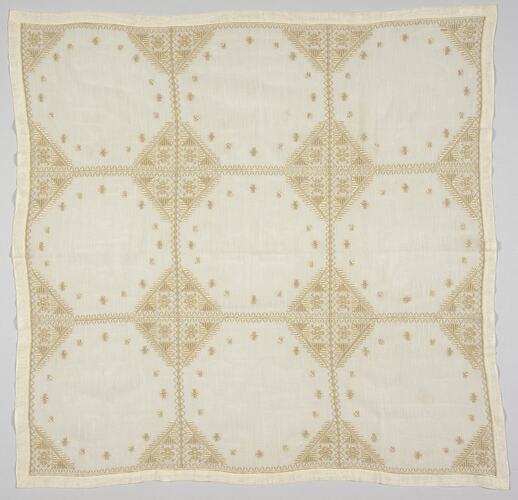 Embroidered table square with geometric design in gold thread repeated nine times.