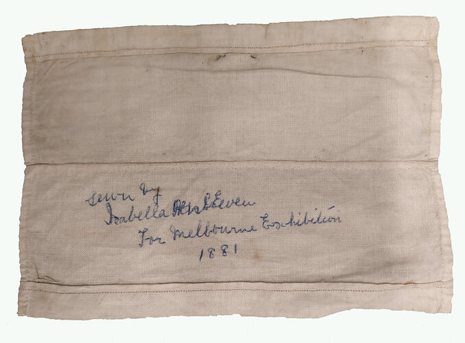 Text, front, handwritten: 'Sewn by / Isabella McEwen / for Melbourne Exhibition / 1881.'