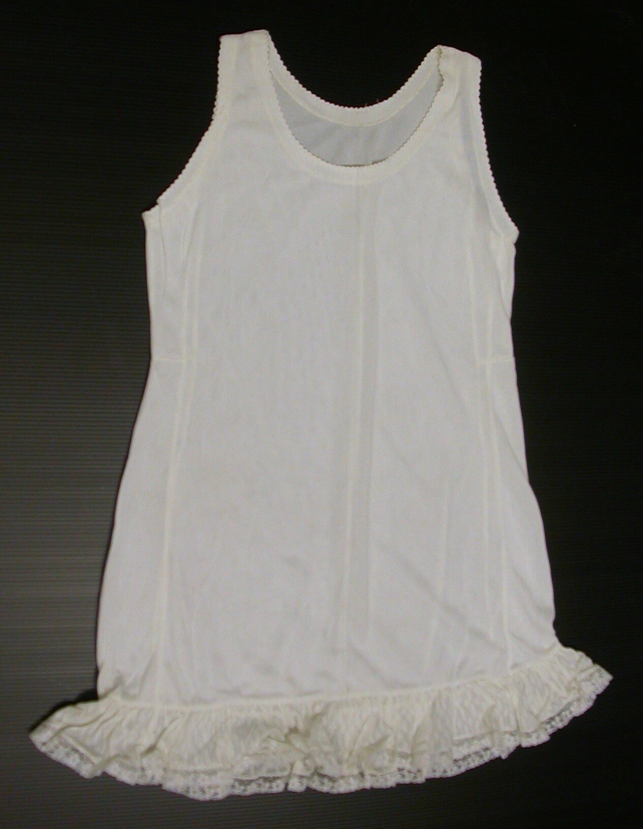 Child's white petticoat of rayon with lace trim of synthetic and cotton lace. 6.5cm frill of diamond pattern rayon on the bottom, lace trimmed. No size marked on garment.