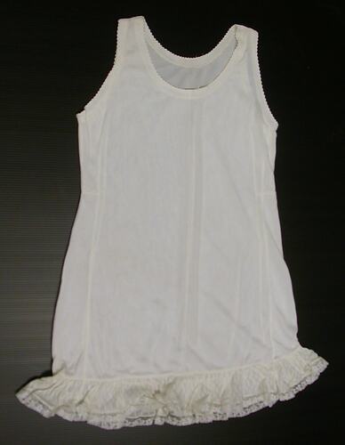 Child's white rayon petticot, made circa 1955. It was acquired with a collection of material from the Steinburg Drapery, located at 142 Elgin Street, Carlton, Melbourne. The business was established around 1930 by Hyman and Phyllis Steinberg.