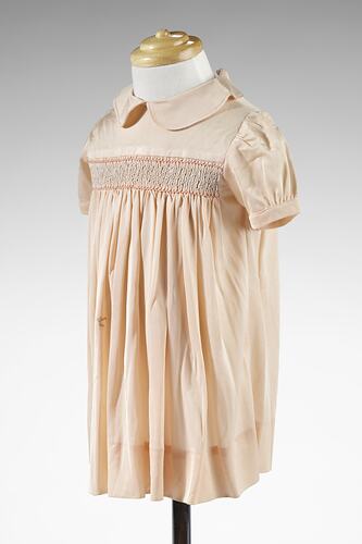 Girl's short dress of peach-coloured nylon, shirred panel at front creating gathered effect from chest. Donor's information was that this object dates from the 1940s.