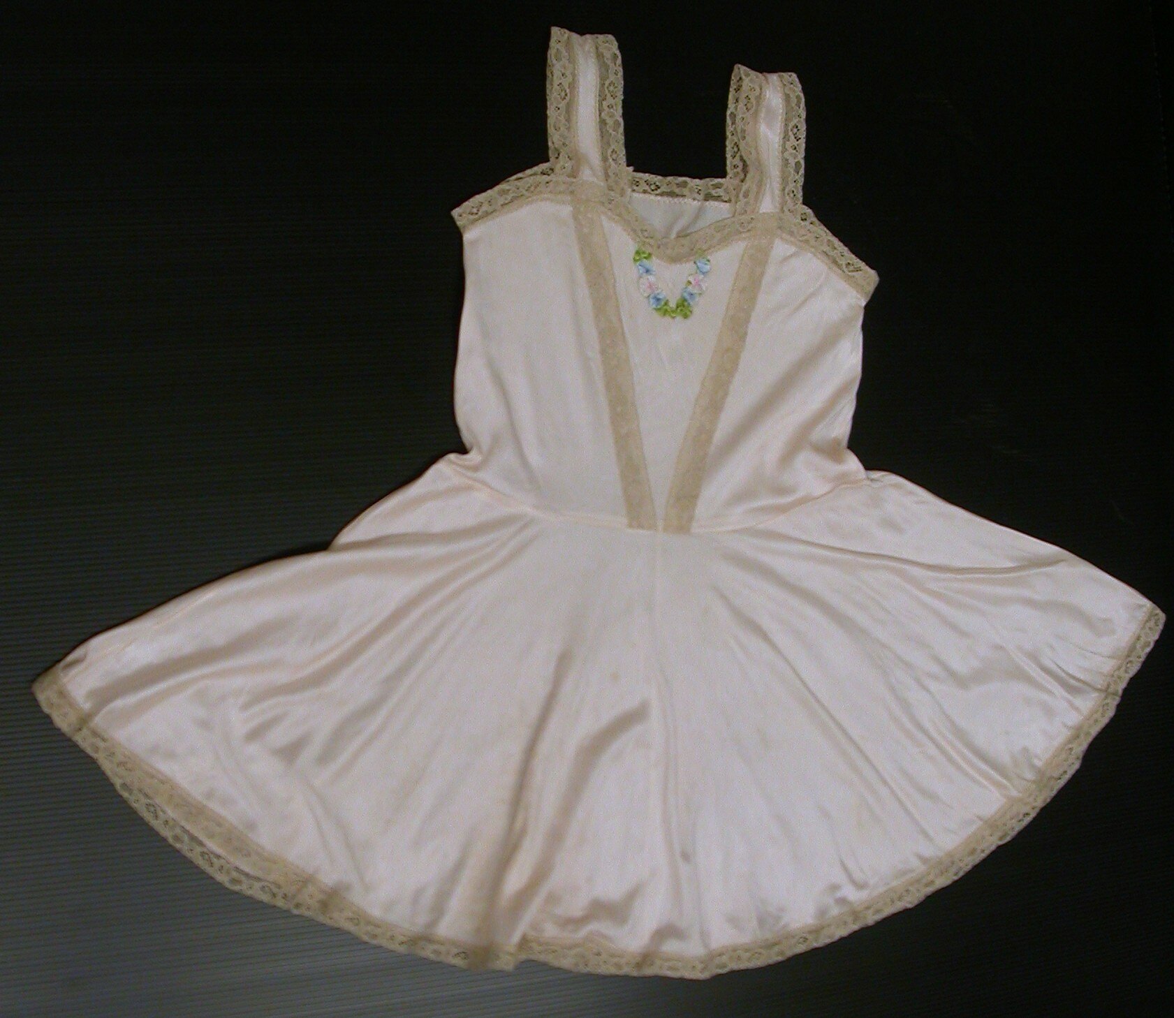 Child's pink rayon petticoat with fawn-coloured lace trim on bodice, straps and hem. Lace on bodice is in V-shape, inside which is smaller V-shaped floral decoration of bunched ribbon. Petticoat has narrow bodice and very full skirt.
