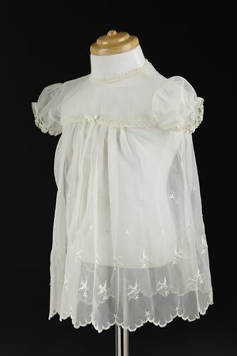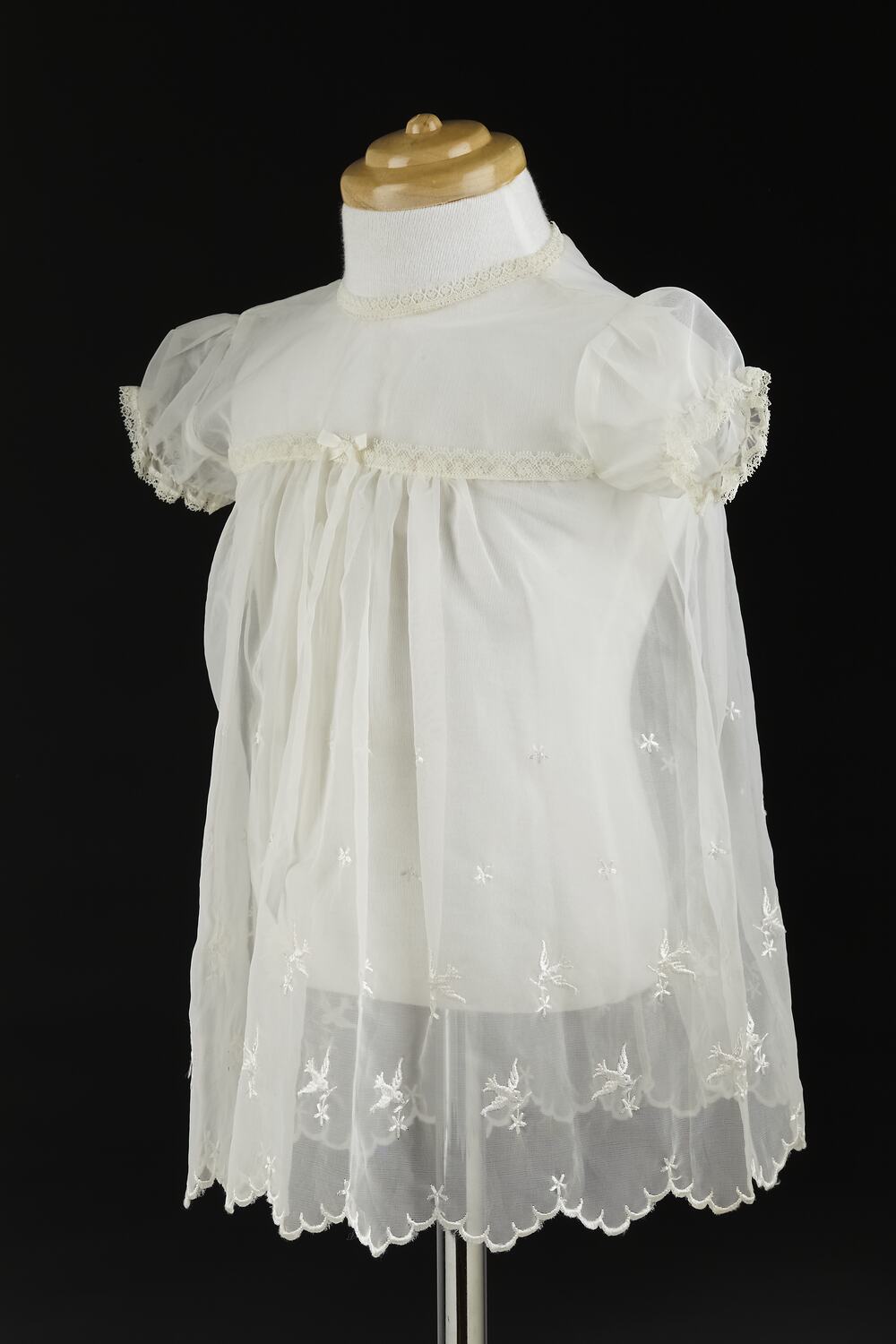 Baby's white nylon dress with gathered yoke front edged with lace, lace edging also around neck and sleeves. Nylon is semi-transparent and embroidered with bluebirds and flowers. Hem of dress is scalloped zigzag which has been finished off with embroidered edging. Sleeves are short, puffed with elastic sewn in. Plastic and hanger removed.