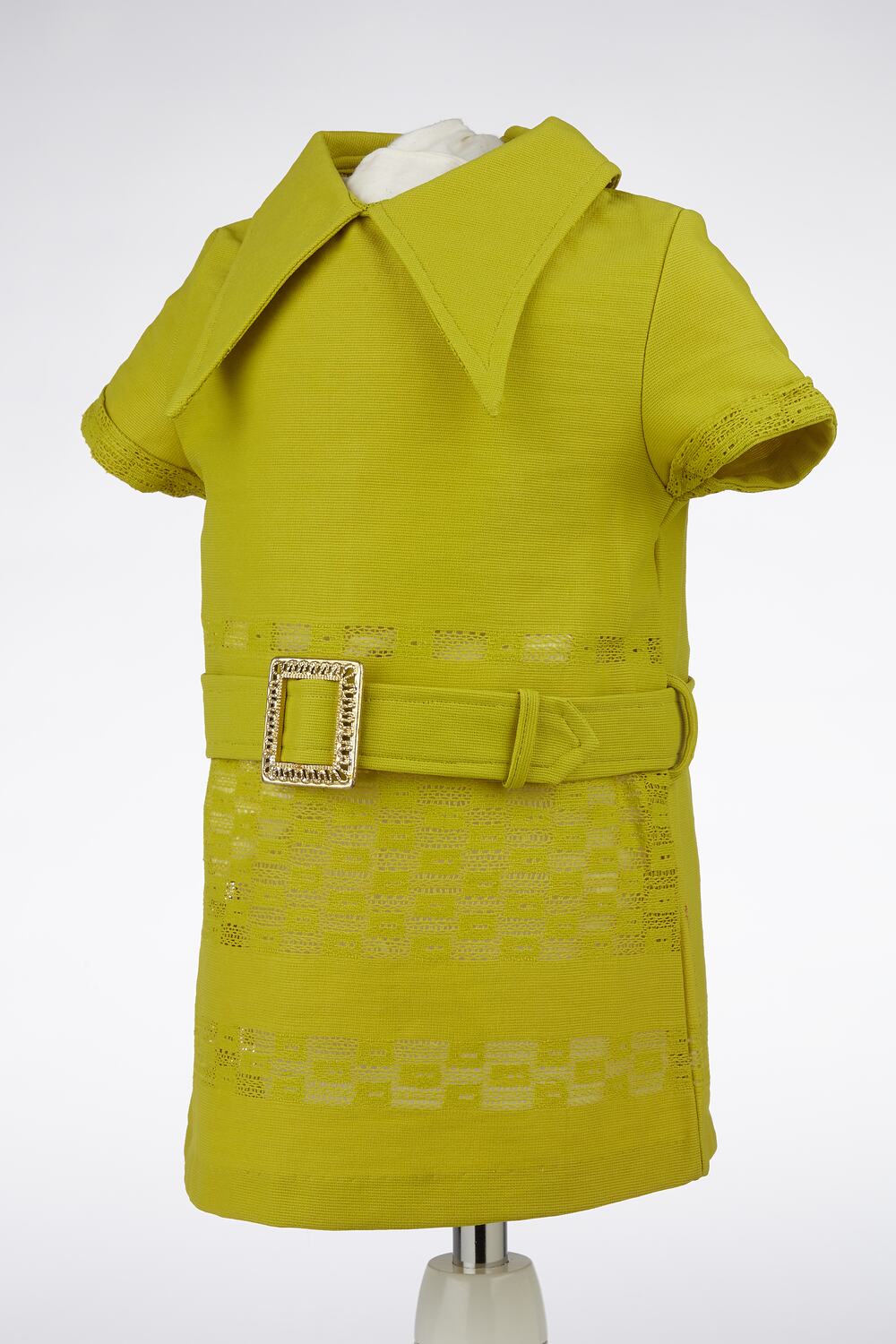 Girl's dress of green nylon short sleeved with pointed dog ear collar. From waist down on front dress has panels of fancy weave (in same fabric) also sewn onto sleeve edges. Garment has matching belt with gold painted plastic buckle. Original tag still attached. Label inside reads : "Skybird/Smartwear" on one side and has care instructions on reverse. Size 16. Plastic cover and wooden coathanger removed. Price marked on tag : $9.99.