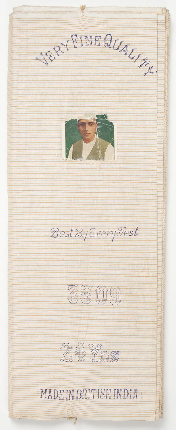 Roll of cream cotton with orange stripe. Stamped on the front. The roll is complete, none of the material has been used. On the front also, a picture of a man in Indian dress. Fabric is wrapped around a thick piece of cardboard and held together at either end with a single stitch.