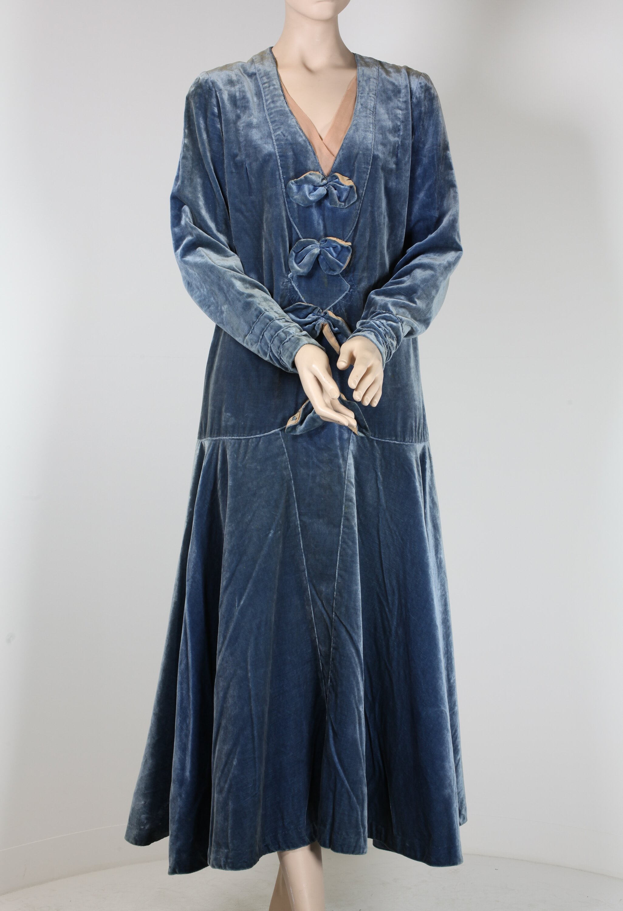 Dress of pale blue cotton velvet. Dress is long-sleeved and has a dropped waist. Bodice front has v-shape and diamond-shape panels and four graduated velvet bows with beige silk lining. Bodice is lined with blue silk. Front bodice shoulder and chest darts. Bodice back has two shaping darts. V-shaped neckline with beige silk v-shaped insert. Set-in sleeves have opening with two press studs at wrist and four narrow tucks on opposite side to opening. Flared four-gore skirt with centre front narrow v-shape panel tapering to hem.