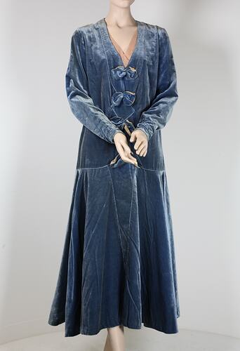 Dress of soft blue cotton velvet, V-necked, long-sleeved, dropwaisted. Used circa 1920-1930. Belonged to Betty Anderson of Kew.