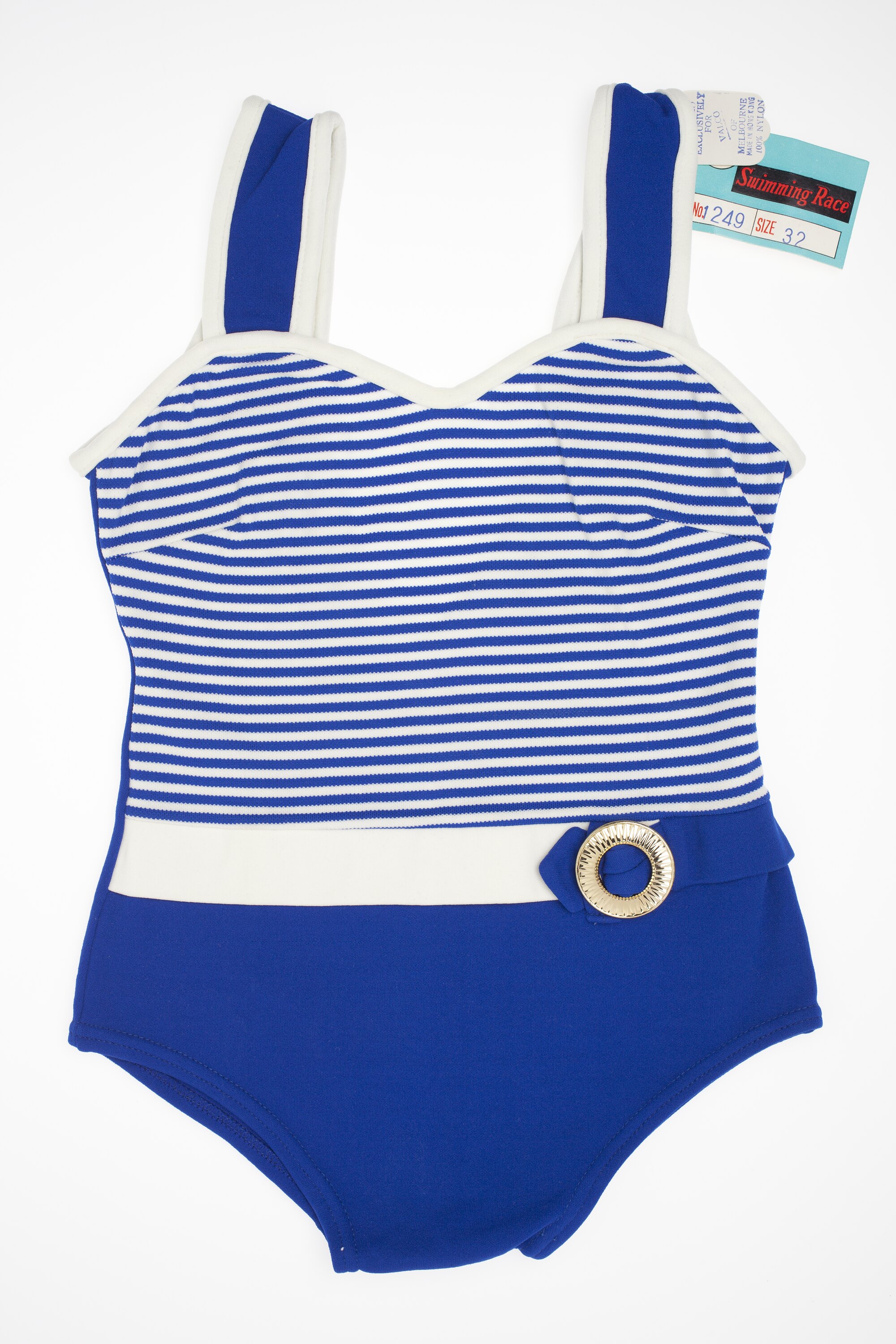 Women's Valco brand bathing costume of white and royal blue, made circa 1965-1975. It was part of the unsold stock held by Steinberg drapery when it closed.