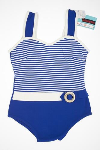 Woman's bathing costume. Nylon, bodice royal blue and white stripes, white and royal blue belt with plastic gold buckle at side, and royal blue from waist down. Royal blue straps with white piping. Also piping along front and back edges V-back.