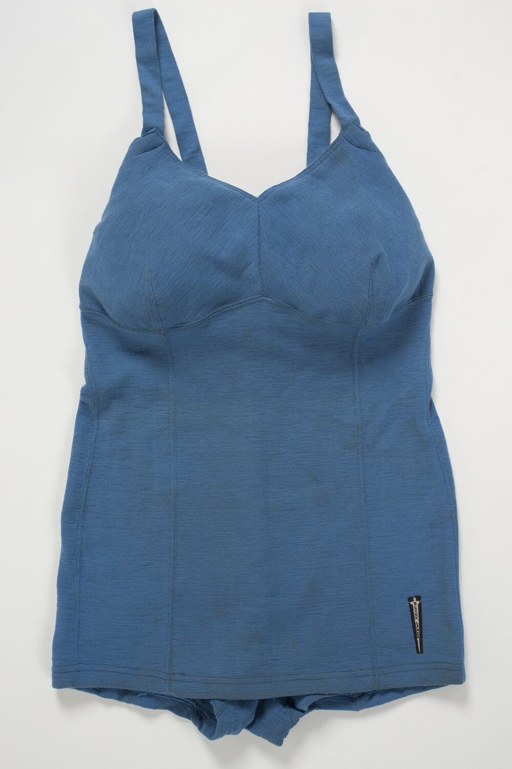 Knitted blue woollen bathing costume sewn in panels with central panel forming half skirt at bottom. No reinforcing in cups. Relatively narrow shoulder straps, V-shaped back. Classic mailot style. Bust and sides lined with cream-coloured wool of finer knit.