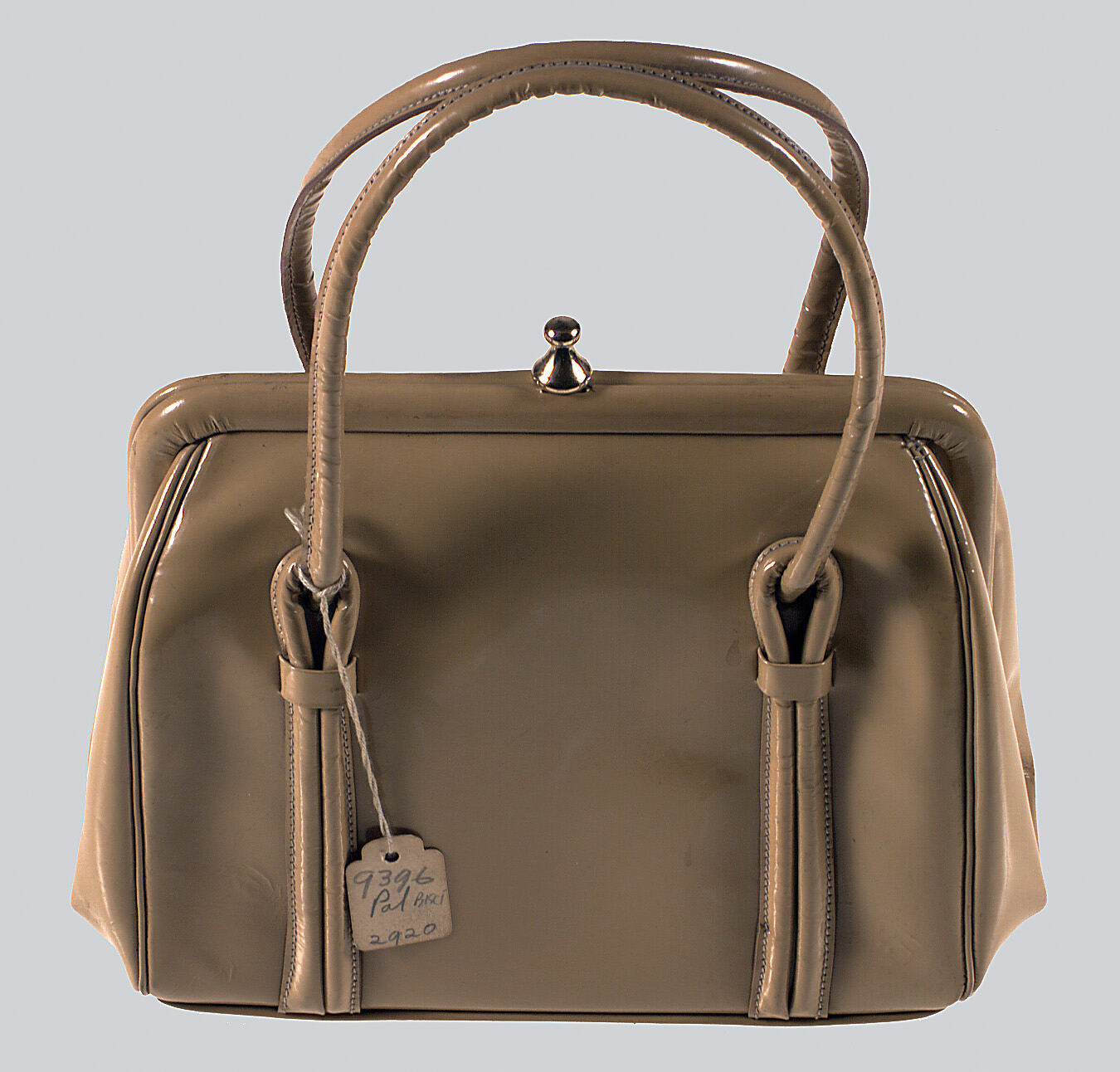 Sand patent leather ladies' handbag, made by Simpson's Gloves Pty Ltd, Richmond, circa 1970-1975.