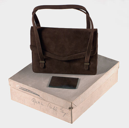 Tan suede ladies' handbag, made by Simpson's Gloves Pty Ltd, Richmond, 1970s. Retailed by Olga Geiger, Collins Street, Melbourne.