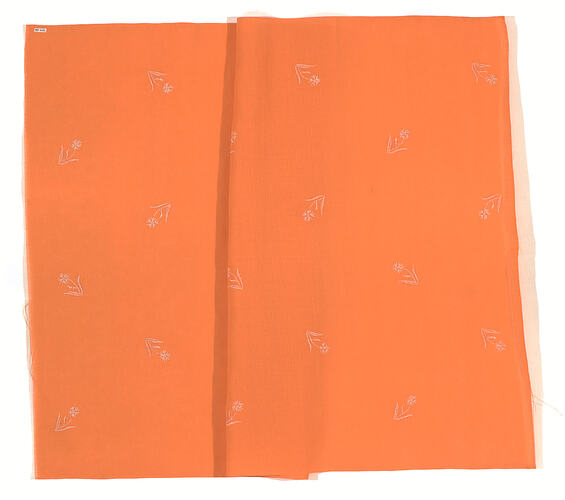 Orange cotton fabric remnant, from Steinberg Drapery, Carlton, circa 1960 - 1965. This type of fabric would have been used for curtains or table linen.