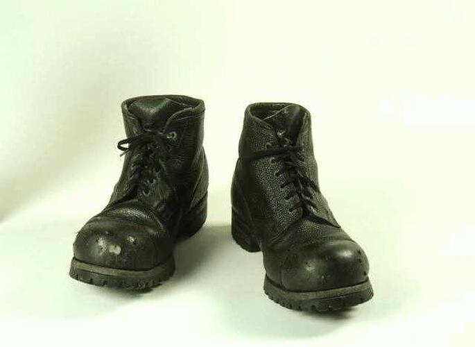 Black British Army leather boots with cleated soles, worn by Dr Phillip Law in Antarctica between 1962 and 1966 predominantly at Heard Island and Macquarie Island, but also in summer for coastal work in Antarctica.