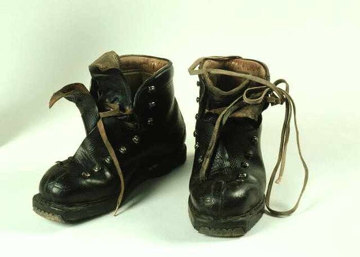 Phillip Law used these boots on skis both in Victoria and in Antarctica over the years 1958 onwards. The skis are now in possession of the Geelong Area Scouts (1992).