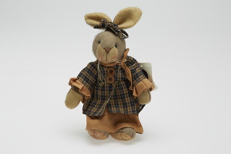 A soft toy rabbit dressed in a checked dress and with sewn long whiskers. Rabbit has original price tag attached.