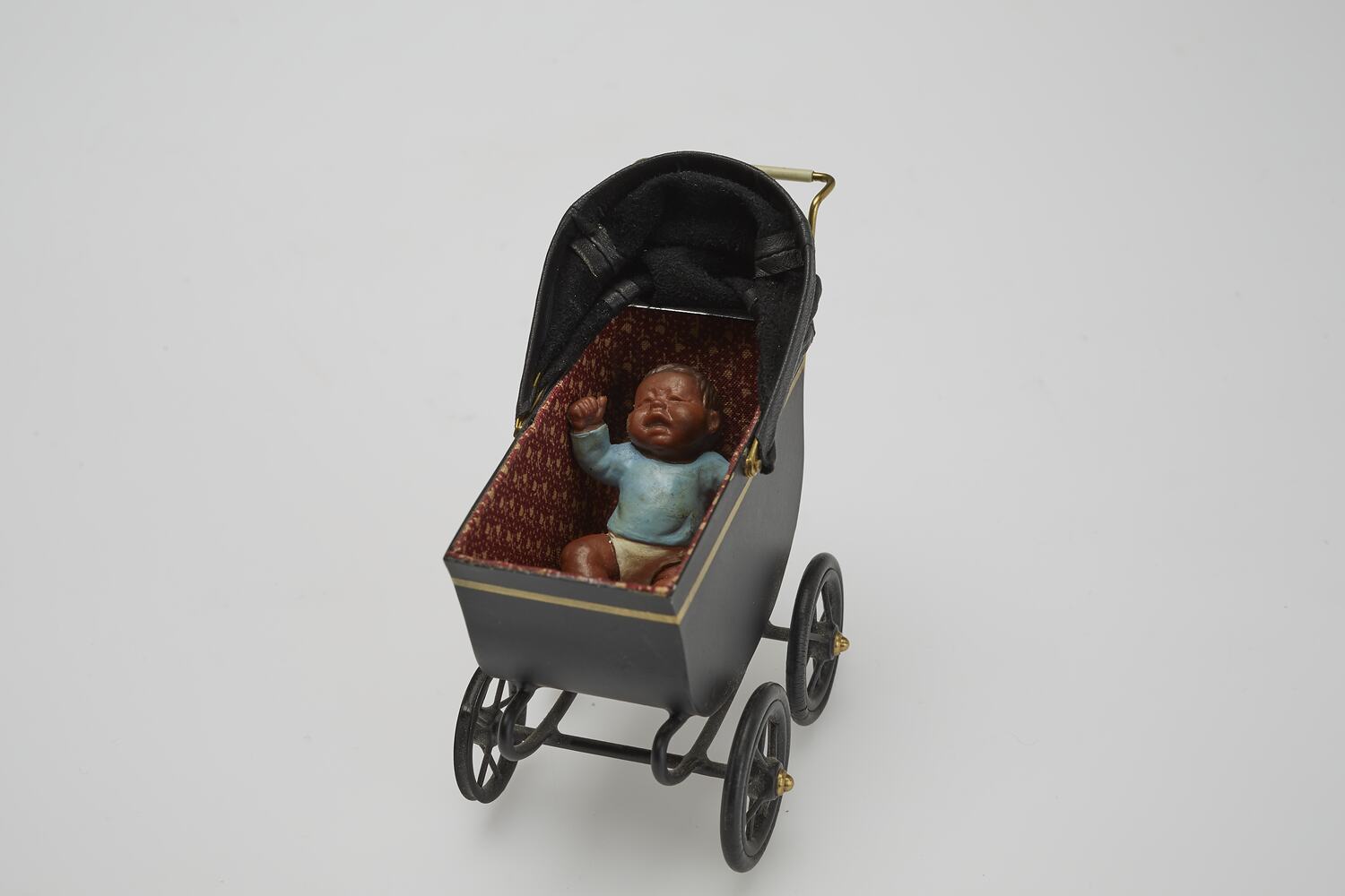 Painted black metal miniature pram with gold painted highlights and folding leather hood. Interior is lined with maroon cotton, patterned with gold tulips. The pram orignally contained a small doll wearing a blue top and white pants. The doll has dark brown skin and hair.