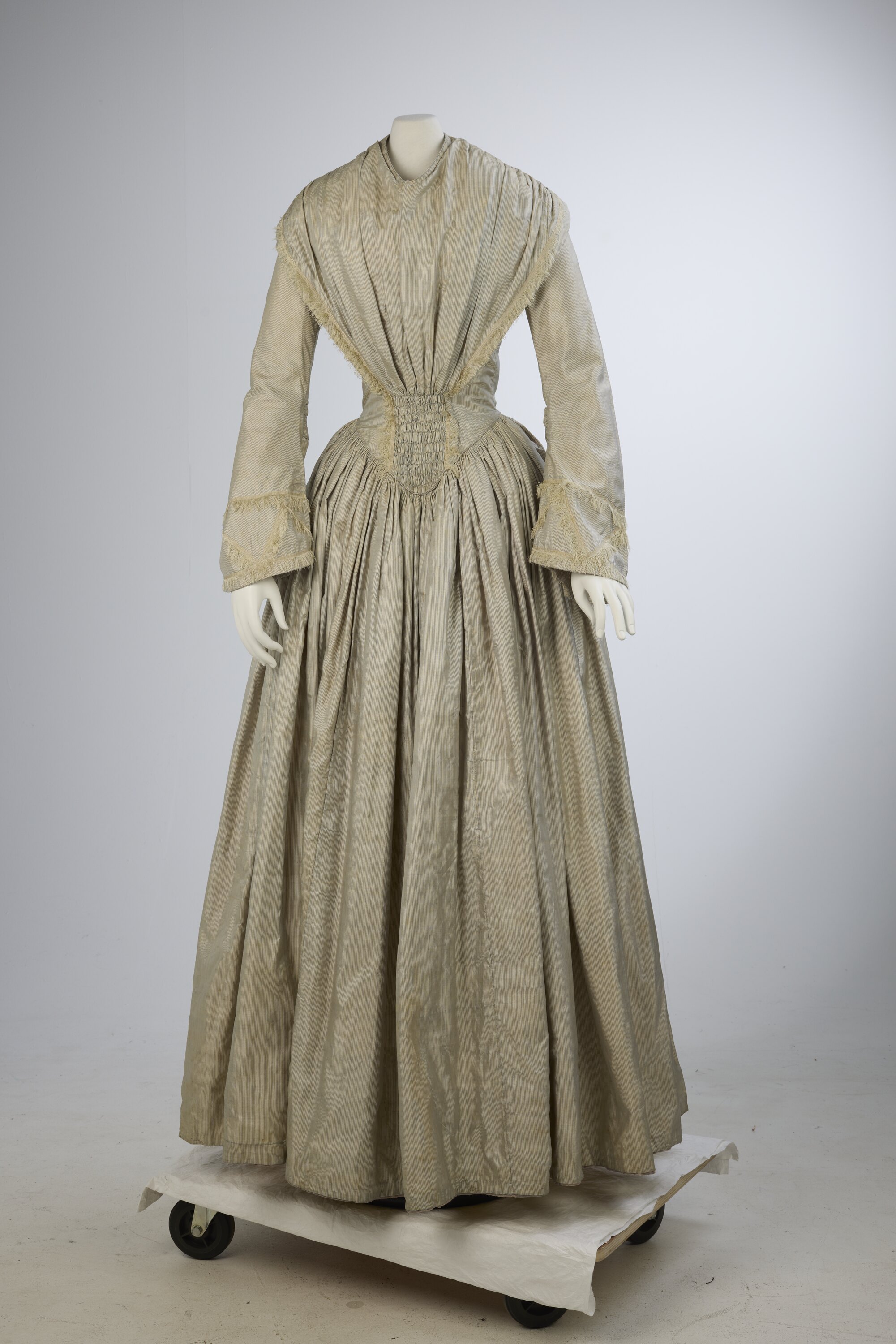 Pale grey striped silk dress with long sleeves. High v-shaped neckline; full skirt gathered into pointed bodice. Fabric gathered from shoulders to narrow panel of smocking at waist, fringed at edge. Fringing also on sleeves. Hooks and eyes down back to waist. Cotton lining. A combination of machine and hand manufacture.