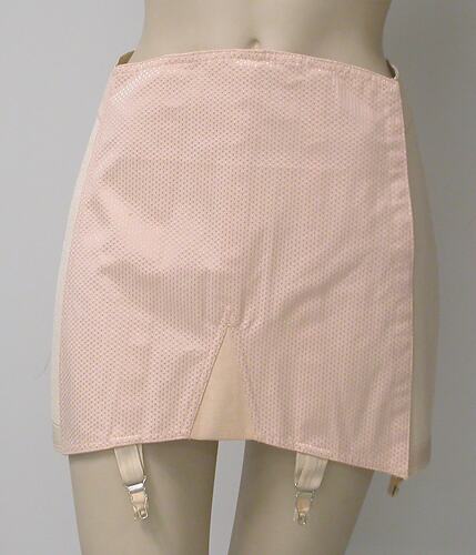 Girdle, pink cotton with embossed pattern of small checks, made circa 1950-1965. Collected from Steinberg's Drapery, 140-142 Elgin Street, Carlton.