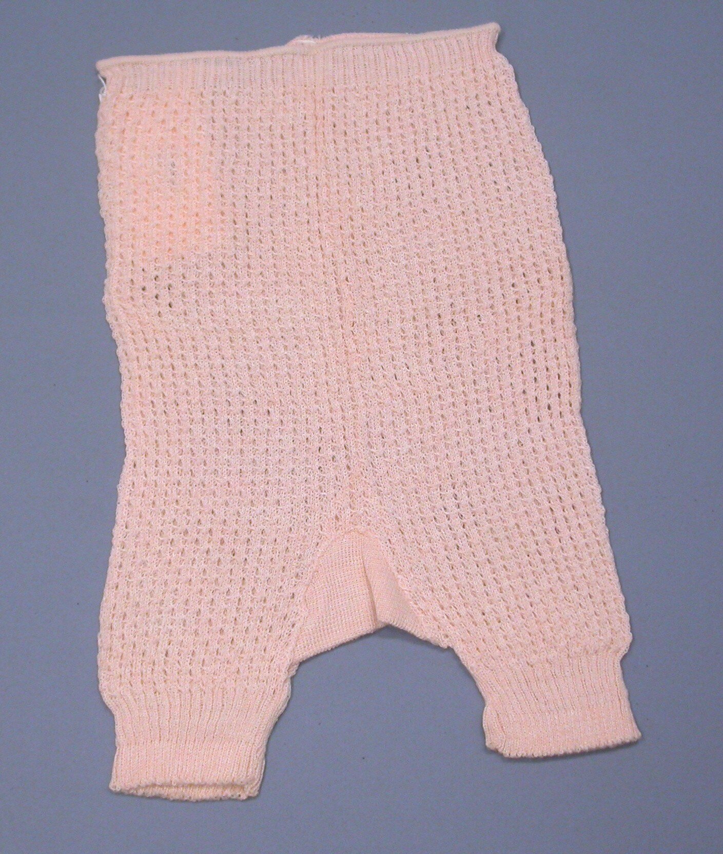 Woman's apricot lacy knitted bloomers. Garment has a knitted waist band and bands at leg openings. Narrow elastic through waist. Gusset knitted separately in finer knit and sewn in. Manufactured from synthetic (acrylic). Size 'W'.