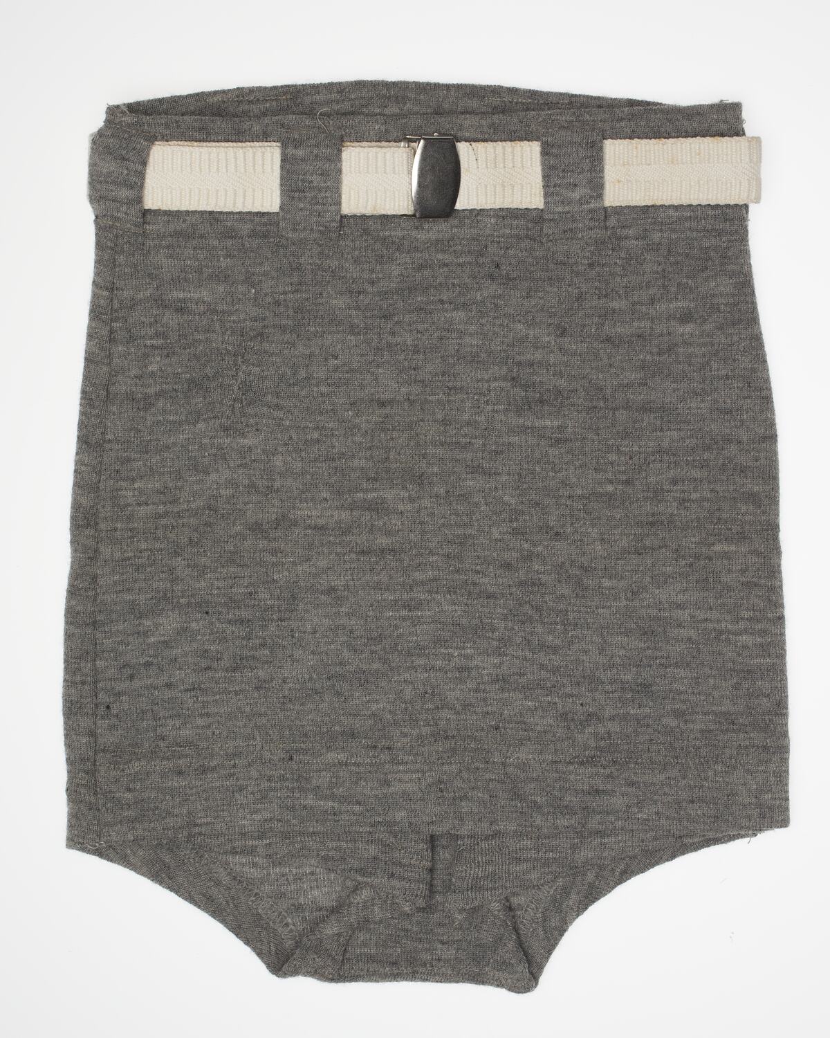 Men's bathing costume of grey knitted wool, size 12. A canvas belt fastened with clip would have been worn with it. There is a small mend on the front left hand side.