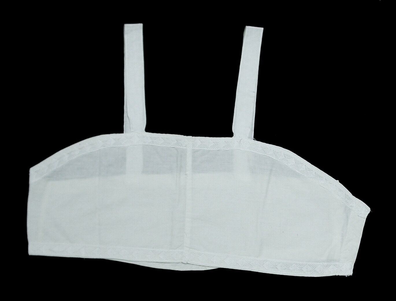 Home-made cream-coloured brassiere. Designed to flatten the chest. Used circa 1920 - 1930, when flat-chested styles were popular for young women.