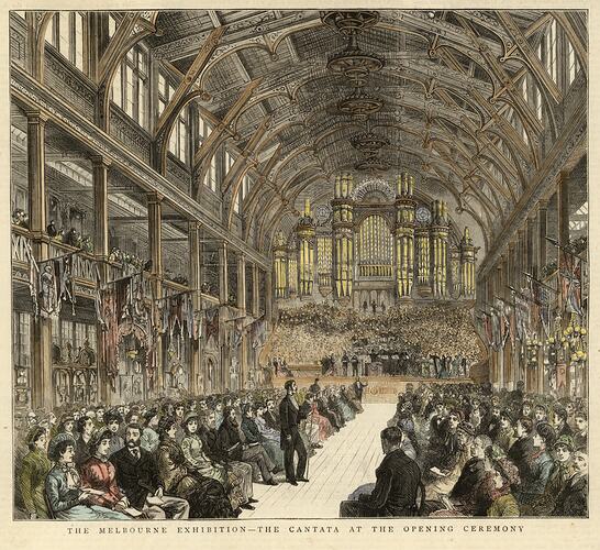 Coloured print, published in 1880, depicting a 1000 strong choir and orchestra performing the specially commissioned Cantata at the opening of the Melbourne International Exhibition on 1 October 1880. A large audience, including the Governor of Victoria, the Marquis of Normanby, and the governors of Western Australia, South Australia and New South Wales, is seated in the foreground of the illustration. All are well-dressed in contemporary fashions. The conductor and composer of the Cantata was Mr Leon Caron.