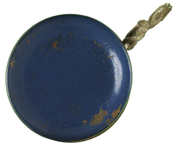 Blue and green wooden yo-yo which forms part of the Australian Children's Folklore Collection (ACFC).