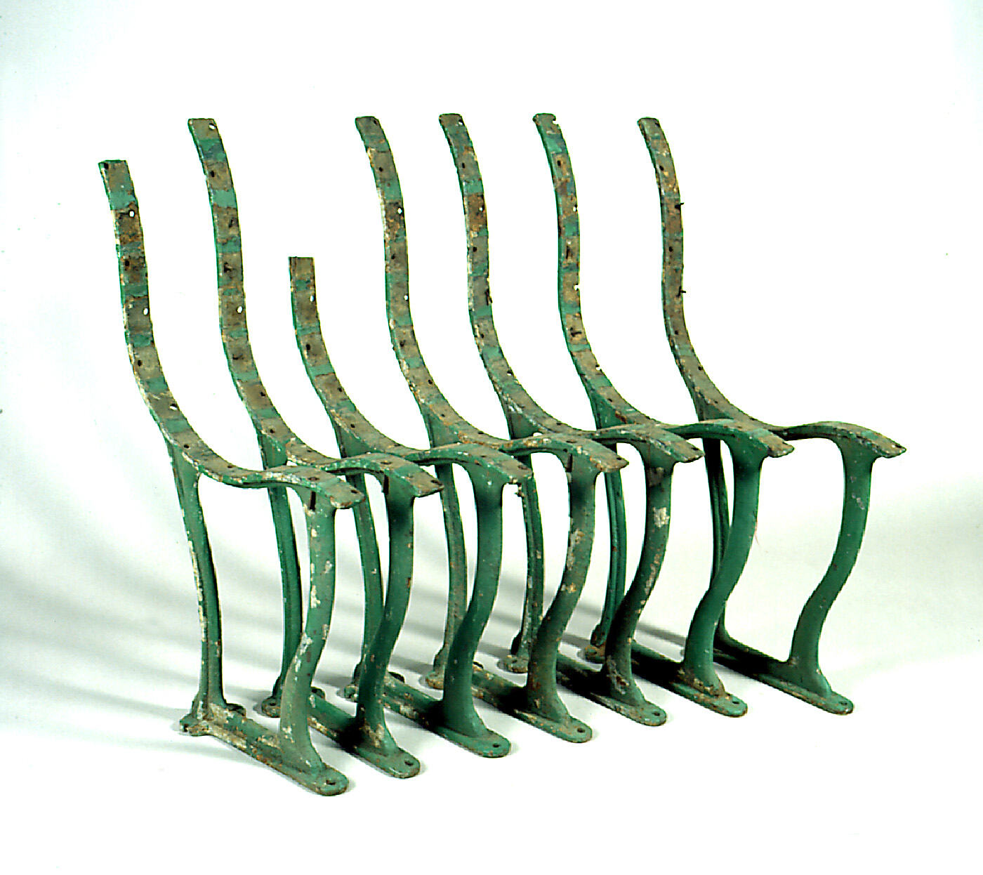 Seven cast iron mounts (two broken at top), painted green, collected by Whelan the Wrecker from the Melbourne Cricket Ground. The mounts have three holes cast in the base, to allow them to be fastened to the floor of the stand at The MCG. There are thirteen holes cast in each seat support, to allow wooden slats (13 of them), to be nailed to the mounts. No wooden slats have been collected. The mount is curved back to support the back of the spectator.