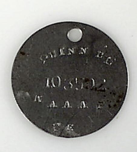 Round metal identity tag from the Women's Auxiliary Australian Air Force, 1942-1944.