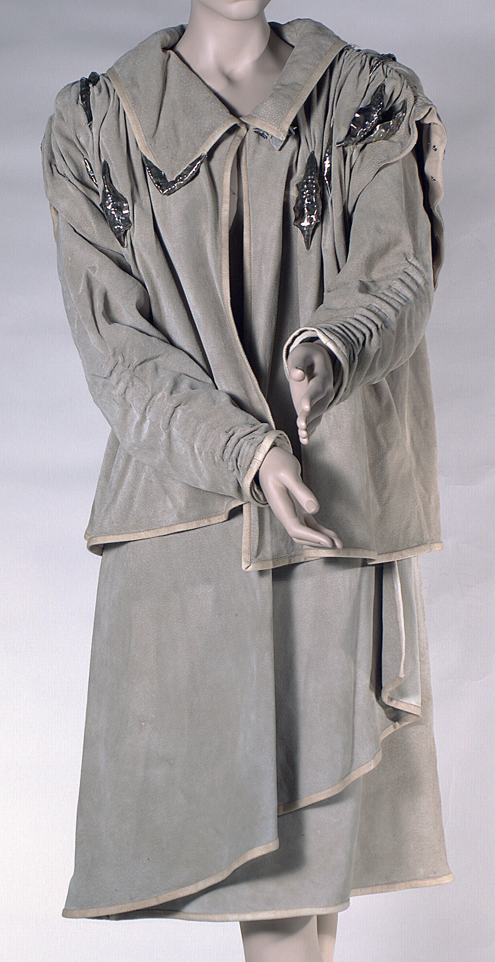 Outfit designed and manufactured in Melbourne by Prue Acton P/L in 1982. It was worn by the donor to the 1982 Melbourne Cup. It was worn with accessories in the Museum's collection (SH 942101, SH 942102 and SH 942103). It was based on themes of 'The Earth' and 'Minerals', also on versatility of the modern woman, as the arms are detachable to allow for the capricious weather.
