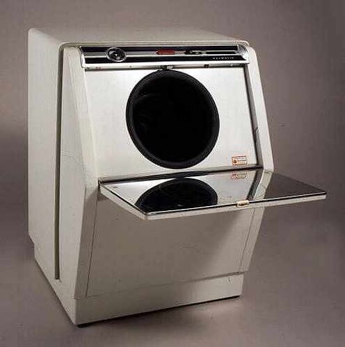 White enamelled, angle-front Hoover "Keymatic" washing machine with "programme cartridge." Front loading, panel above, and hinges downwards to reveal opening of 24.5cm 0. Barrel is 34cm D, and coated with mid-blue enamel. In centre of rear is small circular agitator (14cm 0) with 6 ridges radiating from central point. Control panel, 50cm L x 6.5 cm W, with circular cycle indicator with a black triangular marker. To right is red door-button (as above), then "PUSH ON/PUSH OFF" switch. On extreme right slot, below which is written word "KEYMATIC" This is designed for accompanying cartridge, 2-sided. Allows for 8 cycles, including "SPIN DRY" and "MINIMUM IRON," using a crude, "slot-controlled," mechanism. On the rear of the machine, a grey electric chord is attached, as well as hot and cold tap pipes and a drainage pipe.