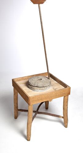 Grinding Mill consisting of: a square wooden bench with four legs, braced with cross pieces, a raised edge and a small piece of upright wood the centre of the bench which is attached to a handle underneath the bench; two round grinding stones; and a long wooden pole which fits into the top grinding stone and is suspended from the ceiling.