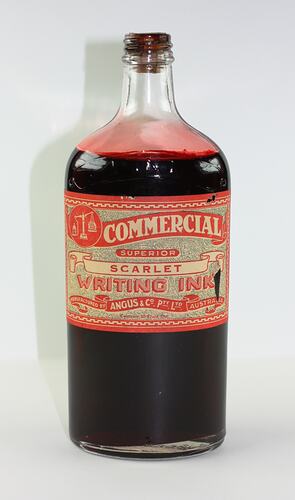 Bottle of red in ink made by Angus & Co. Pty Ltd. It was used in the office of a psychiatric hospital in Victoria, circa 1848-1950.