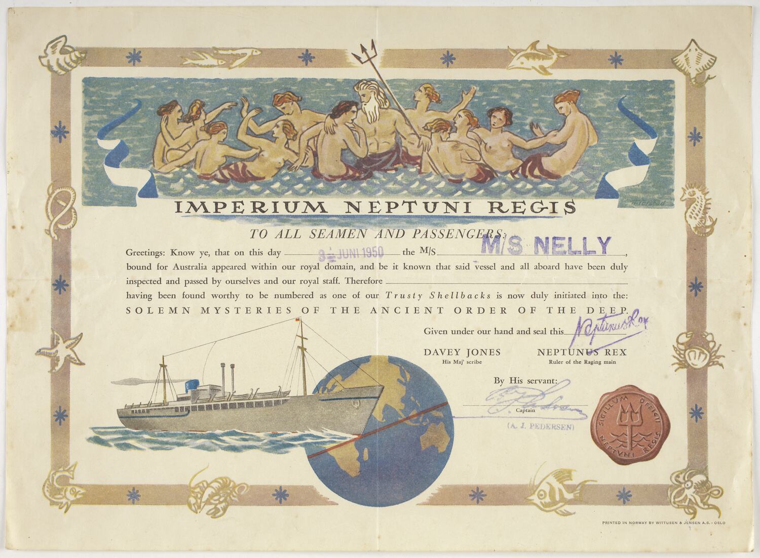 Crossing the Equator Certificate, published by Wittusen & Jensen AS, circa 1950. It was issued to passengers on the MS Nelly for crossing the equator on 3 June 1950. This certificate was given to either Nicolae or Barbara Condurateanu on their voyage to Australia in 1950.
