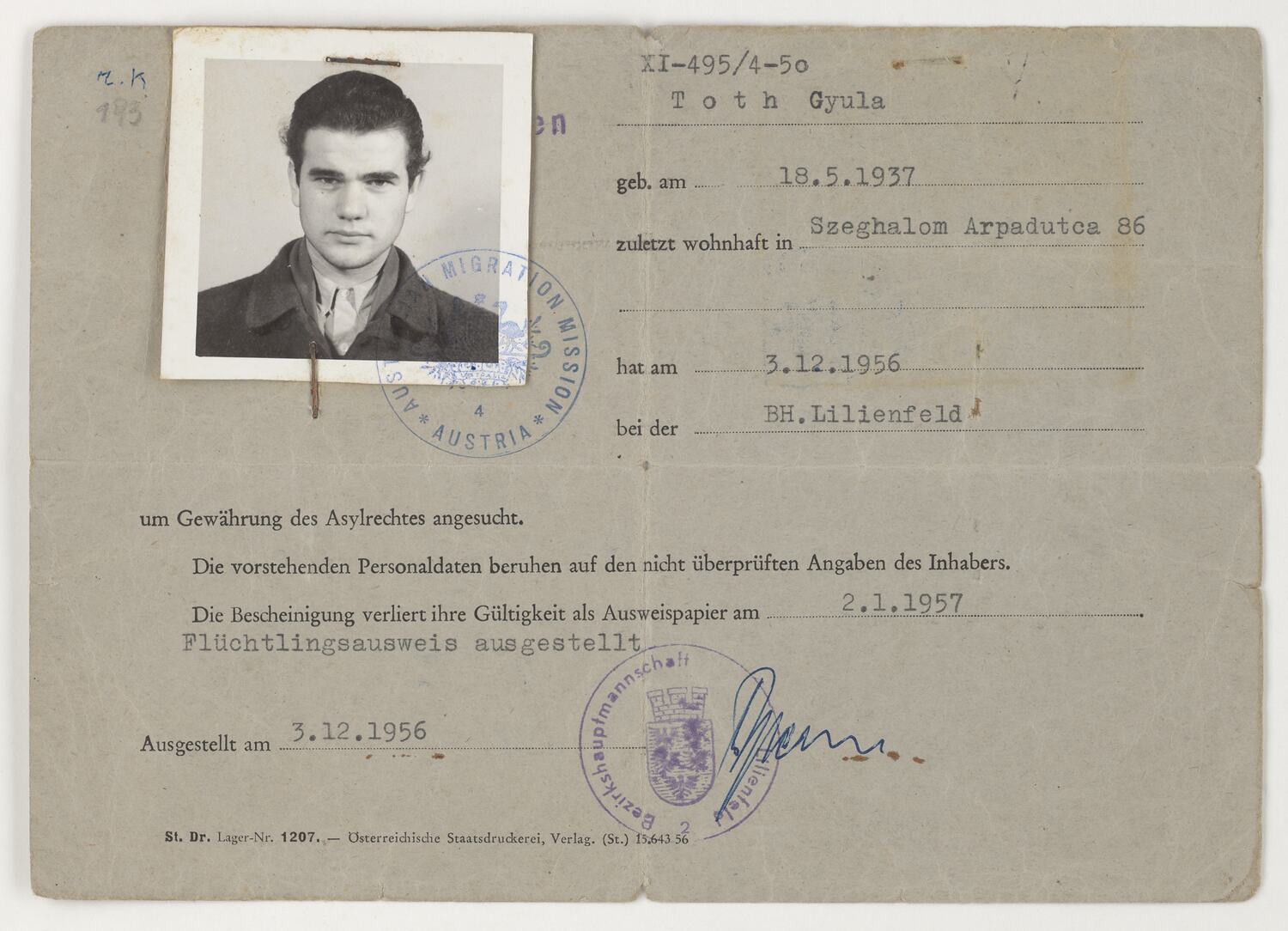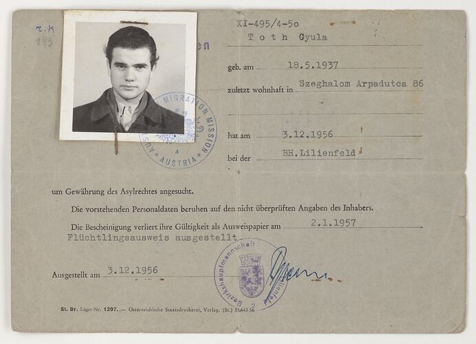 Refugee Identification Card for Gyula (Julius) Toth, issued by the Commonwealth of Australia. In 1957 Julius came to Australia after he escaped the Russian invasion of Hungary, leaving his family in Hungary, he survived a dangerous journey alone to escape across the border to Austria. He was only able to bring a few possessions with him including his moulding tools, cigarette holder and photo album, which were 18th birthday presents from a sister and friend.