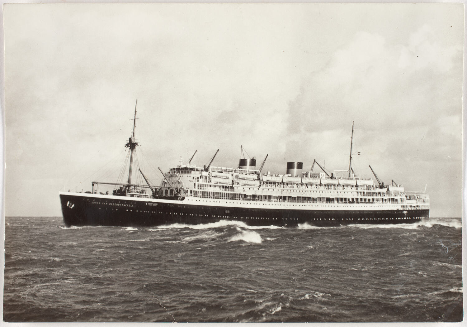 Double sided cardboard postcard. One side contains image of the ship MS Johan Van Oldenbarnevelt, in black and white.
