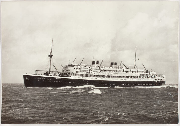 Postcard of the MS Johan Van Oldenbarnevelt, a Dutch ship used as a migrant ship between Amsterdam and Australia from 1950 to 1959. It depicts the ship that Julius Toth immigrated to Australia on, in 1957. Julius came to Australia after he escaped the Russian invasion of Hungary, leaving his family in Hungary, he survived a dangerous journey alone to escape across the border to Austria. He was only able to bring a few possessions with him including his moulding tools, and cigarette holder and photo album, which were 18th birthday presents from a sister and friend.